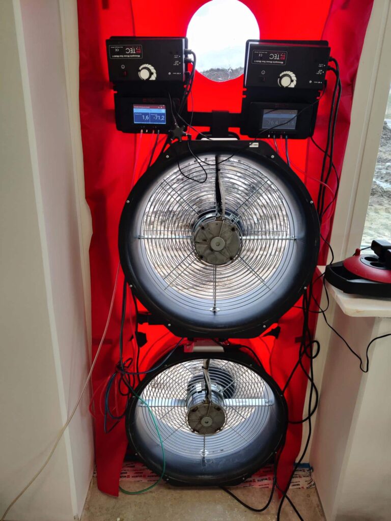 Selvom det ikke er et lovkrav at udføre blowerdoortest, før boligen er helt færdigt, kan det være en rigtig god ide at udføre en for-test. Det vil sige, at trykteste bygningen på det tidspunkt, hvor dampspærren stadig er synlig. Dermed kan utætheder lokaliseres og udbedres, inden loft, væg m.m. opsættes. På den måde undgås det, at der skal udføres unødigt arbejde senere, hvis det viser sig, at boligen ikke kan overholde tæthedskravet jf. bygningsreglementet. Vi tryktester og termograferer ved færdigmeldingen af energimærkningen, som også er en del af DGNB-certificeringsordningen.